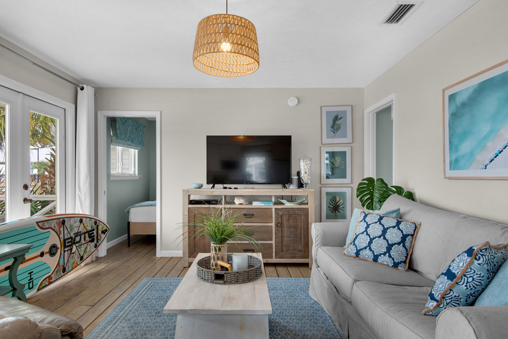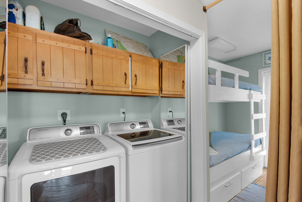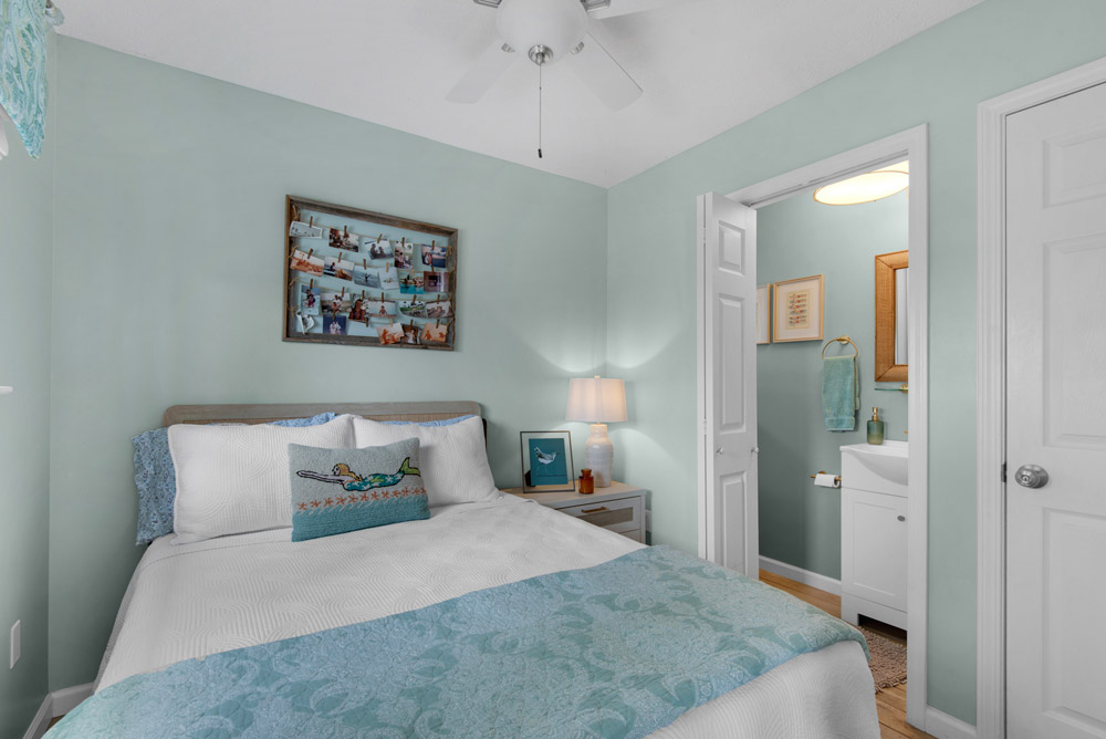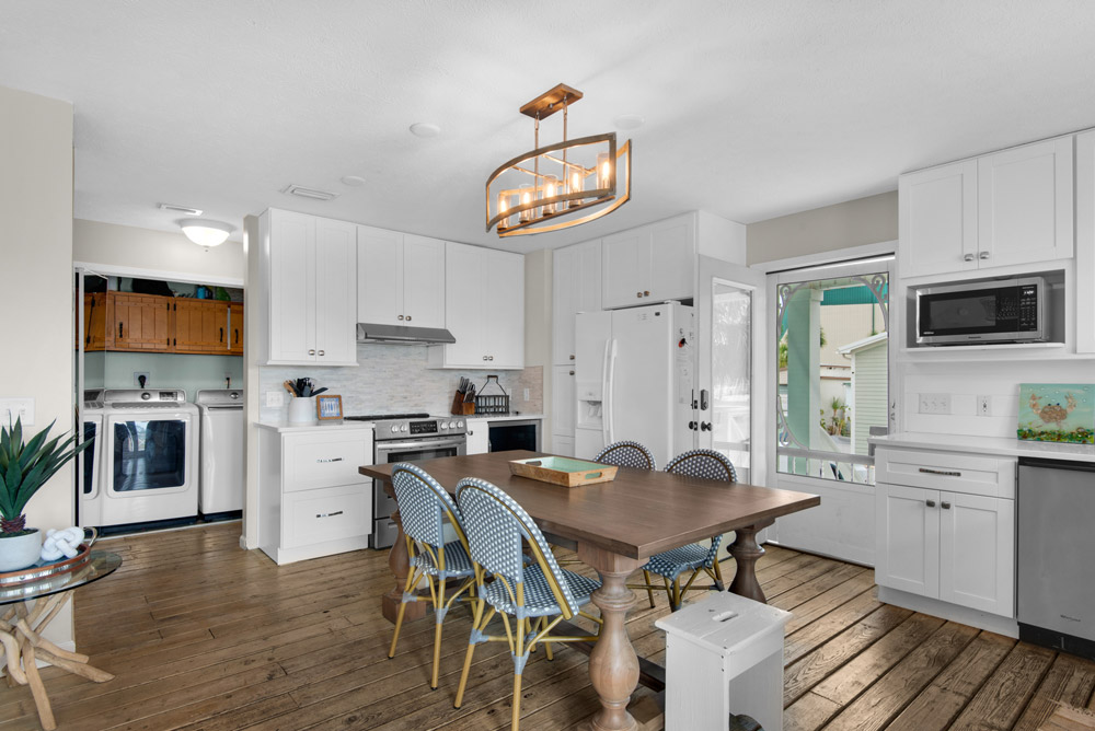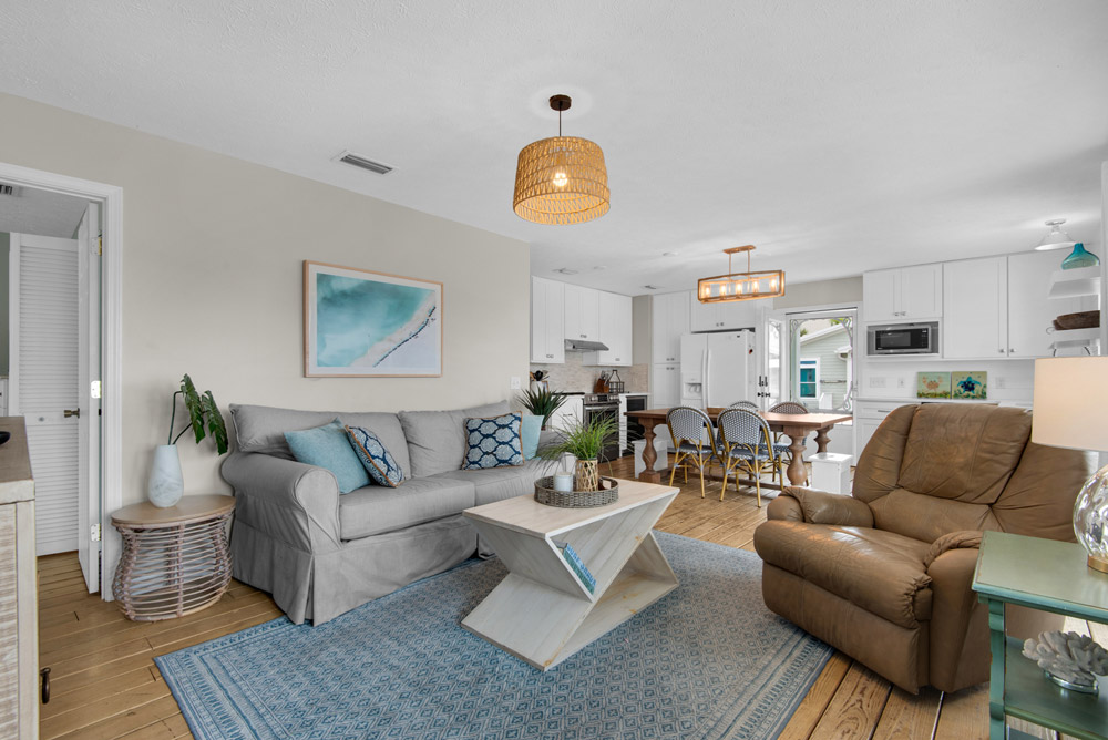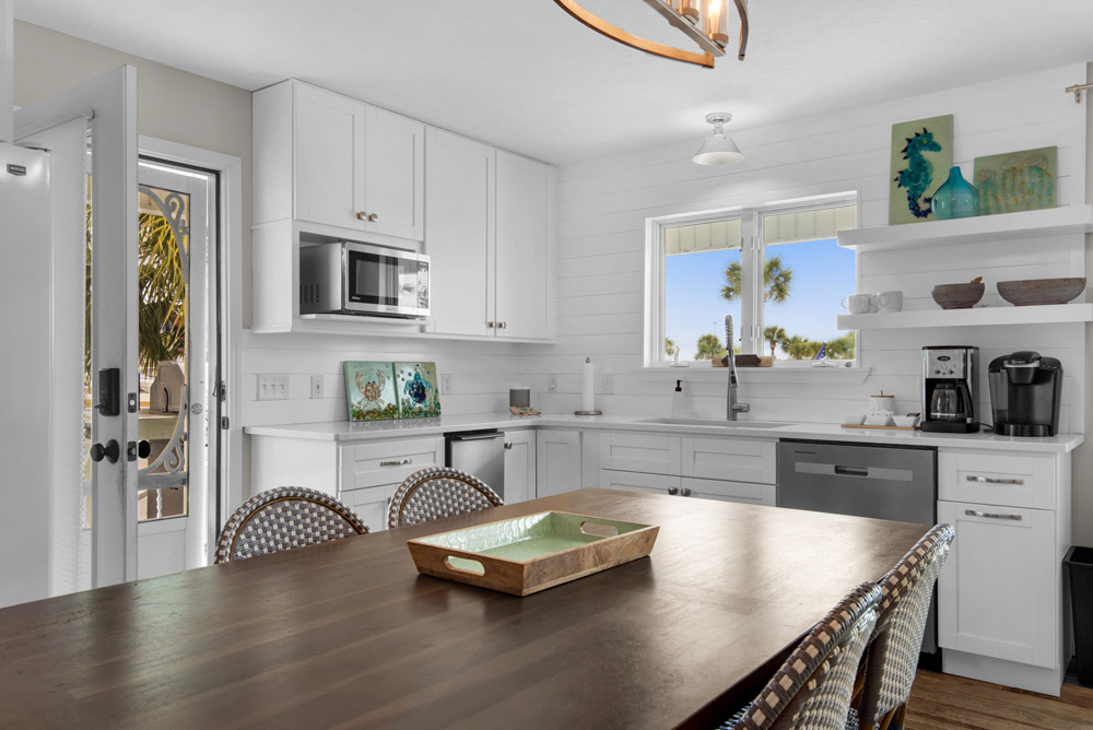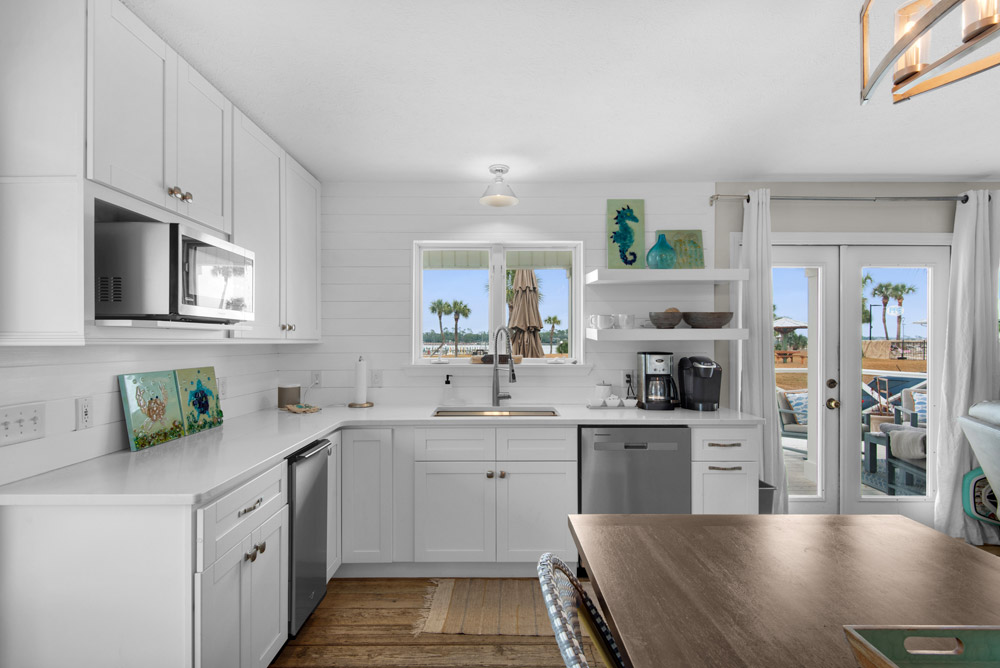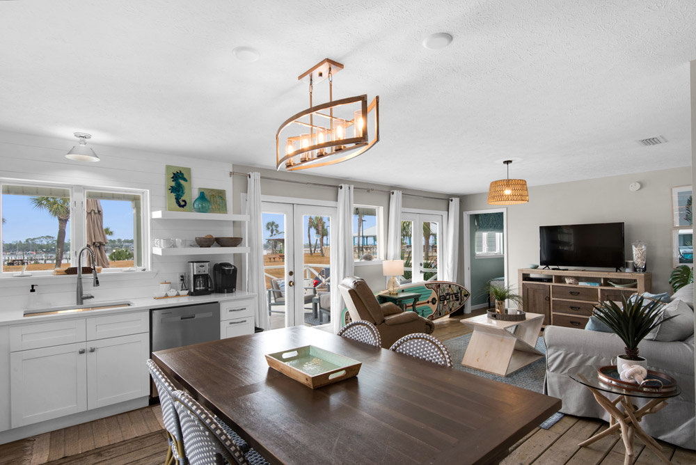 An open design offers sweeping views of the lagoon from the living room, kitchen and dining areas (all great spots to watch the morning fishing fleet depart with a hot cup of coffee). A washer and dryer, fully equipped kitchen offers all you need for some good coastal cooking or a peanut butter and jelly sandwich – you decide.